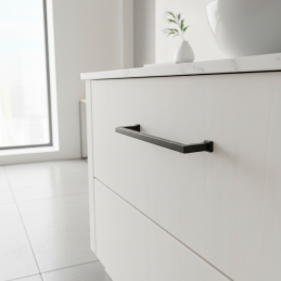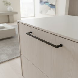 Moderní hranatá úchytka v minimalistickém designu, vhodná do moderních i industriálních interiérů. Díky čistým liniím a matnému černému povrchu je ideální pro kuchyňské linky, skříňky i komody.