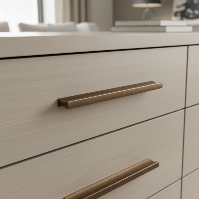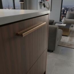 Úchytka PIREA v provedení broušená mosaz je designový doplněk, který dodá nábytku luxusní a štíhlý moderní vzhled. Její minimalistická linie s jemným ergonomickým frézováním působí elegantně, čistým dojmem a přirozeně zapadne do moderních interiérů, high-end kuchyní či designového nábytku.