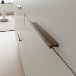 Broušená mosaz vytváří teplý, sofistikovaný metalický efekt, který se krásně kombinuje se dřevem, bílými povrchy i tmavými odstíny. Úchytka je úzká, ale pevná a díky propracovanému tvaru se velmi příjemně uchopuje.