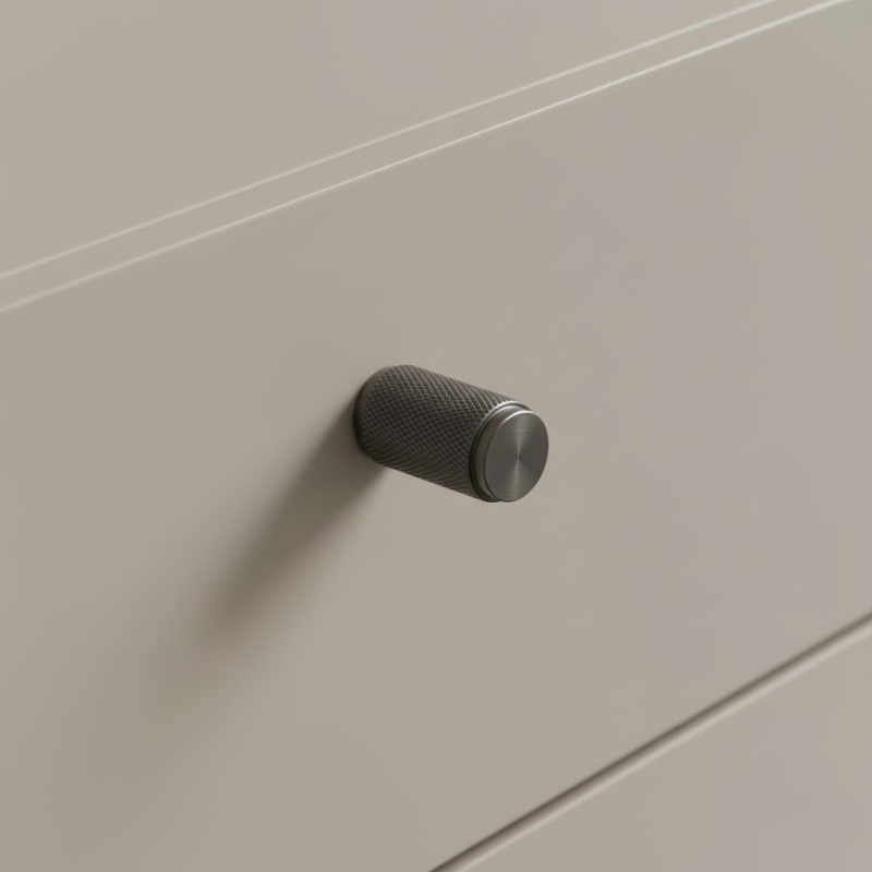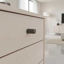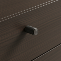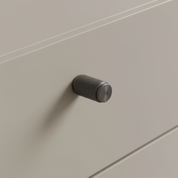 Knopka LAYLA v černém grafitovém provedení je moderním a technicky působícím doplňkem, který zaujme jemně rýhovaným (knurled) povrchem. Tento detail nejen zvýrazňuje industriální charakter, ale zároveň zlepšuje úchop a komfort při každodenním používání. Matný grafitový odstín působí elegantně a výborně se kombinuje s černým, šedým, betonovým i dřevěným nábytkem.
