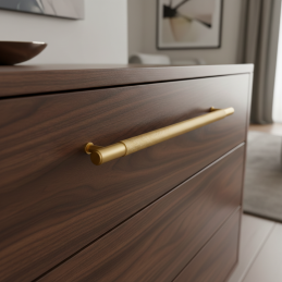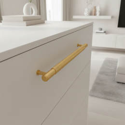 Broušená zlatá povrchová úprava působí nadčasově a exkluzivně, díky čemuž se úchytka skvěle hodí do moderních, glamour i industriálních interiérů. Výborně vynikne na tmavém nábytku, přírodním dřevě i na světlých lakovaných plochách a dodá prostoru prémiový akcent.