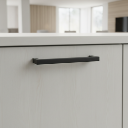 Moderní a minimalistická nábytková úchytka s rovnými liniemi, která se hodí do kuchyní, koupelen i moderního nábytku. Matná černá povrchová úprava působí elegantně a nadčasově a zároveň je praktická na údržbu. Úchytka je určena k montáži pomocí šroubů ze zadní strany dvířek nebo zásuvek.