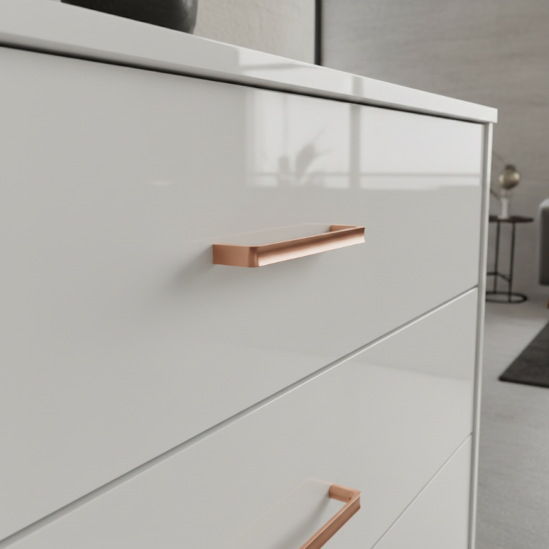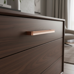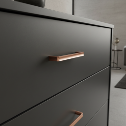 Úchytka SVOOP v povrchové úpravě měděná matná spojuje minimalistický tvar s trendovým barevným provedením, které dodá nábytku elegantní, moderní a zároveň útulný charakter. Její čisté linie a jemně zkosené hrany působí sofistikovaně, zatímco matná měď přináší příjemnou hřejivou atmosféru do každého interiéru.