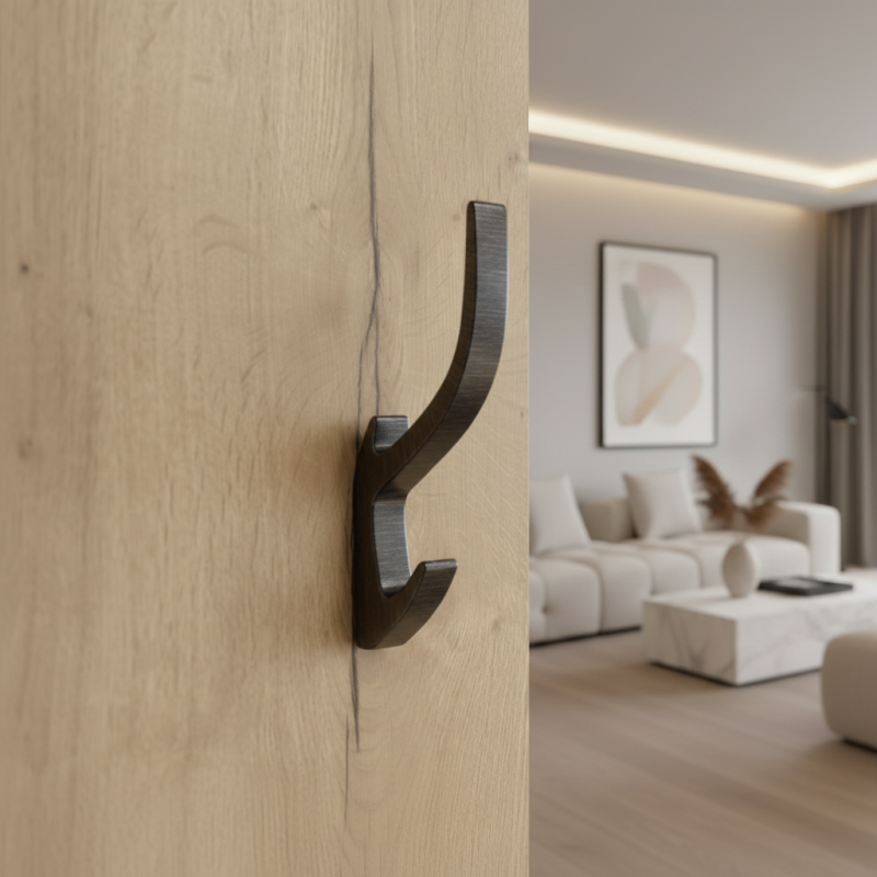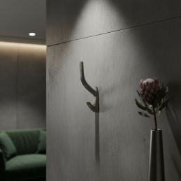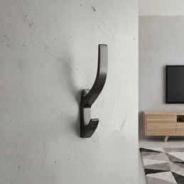 Moderní věšák KOS v elegantním černém broušeném provedení nabízí kombinaci minimalistického designu a jemné textury kovu. Broušený povrch dodává věšáku luxusní matný vzhled, který se skvěle hodí do moderních, industriálních i prémiových interiérů. Praktický dvojitý háček umožňuje pohodlné odkládání oblečení, ručníků či doplňků.