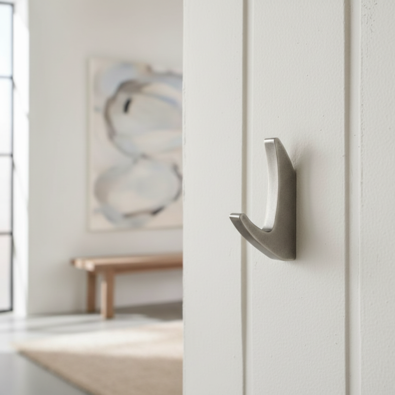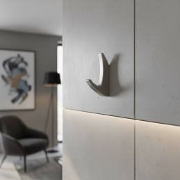 Věšák KOS Mini v elegantním nikl broušený provedení je ideální doplněk do moderních i klasických interiérů. Jemná broušená struktura povrchu dodává věšáku prémiový vzhled a zároveň zvyšuje odolnost proti poškrábání.