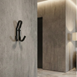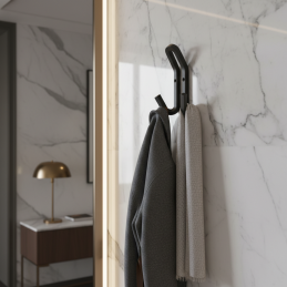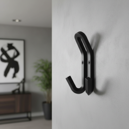 Kovový designový věšák v moderním provedení, vhodný do předsíní, chodeb, koupelen i šaten. Díky pevnému kovovému provedení je odolný a určený pro každodenní používání. Dvojitý háček umožňuje praktické zavěšení oblečení, tašek či doplňků.