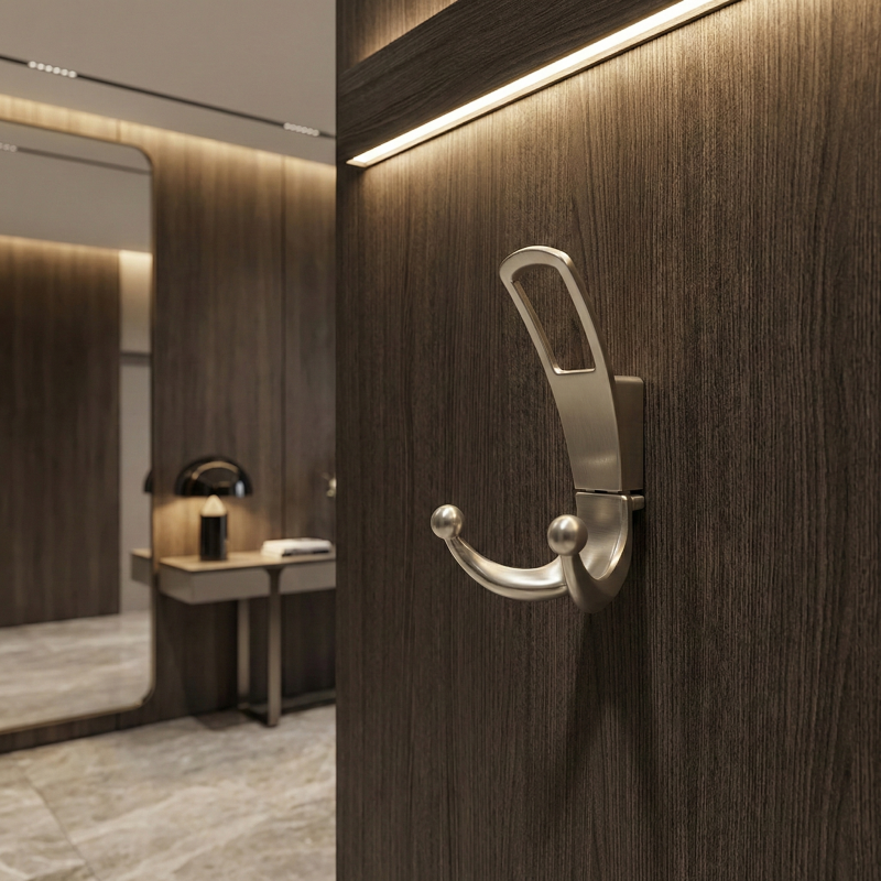 Věšák má jednodílnou konstrukci se spodním dvojitým háčkem, který poskytuje dostatek prostoru pro zavěšení kabátů, bund, tašek nebo doplňků. Je určen k montáži zepředu na stěnu nebo nábytek, s viditelnými upevňovacími body pro jednoduchou a rychlou instalaci.