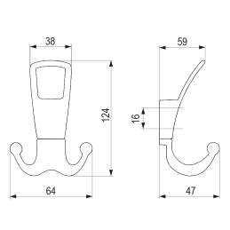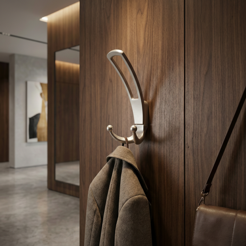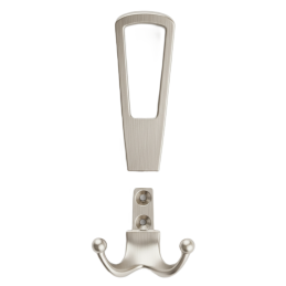 Věšák má dvoudílnou konstrukci, která se skládá z horního madla a spodního dvojitého háčku, čímž poskytuje dostatek prostoru pro zavěšení kabátů, bund, tašek nebo doplňků. Je určen k montáži zepředu na stěnu nebo nábytek, s viditelnými upevňovacími body pro snadnou instalaci.