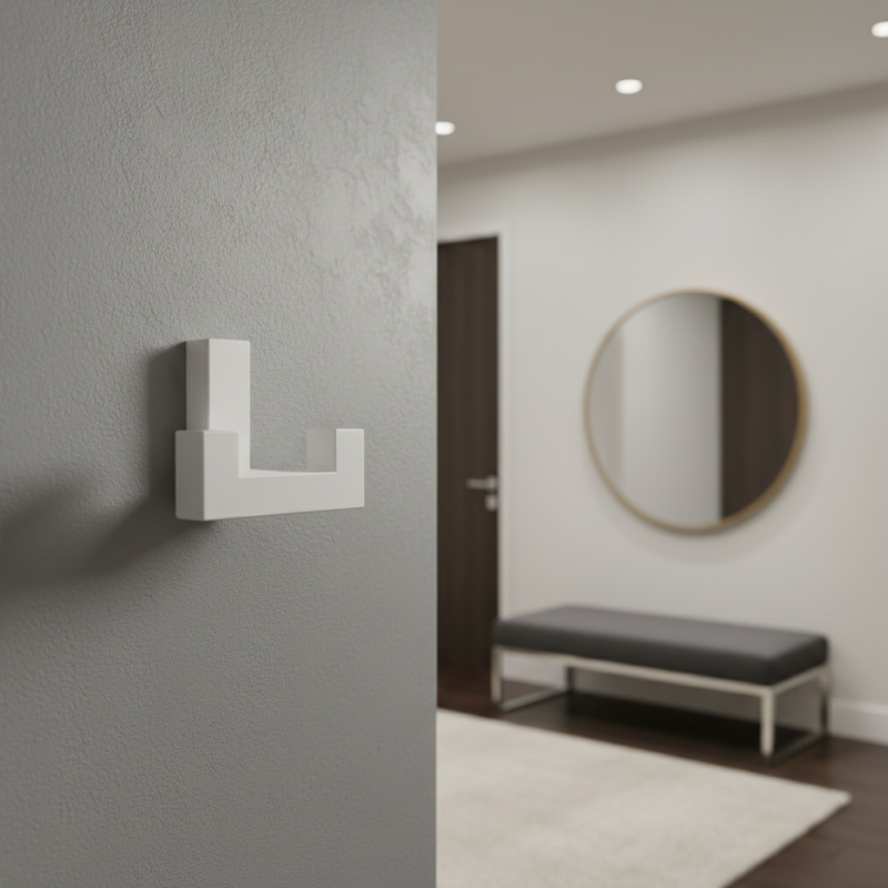 Elegantní a praktický věšák v moderním designu s přední montáží na podložku. Instalace je jednoduchá - podložka se připevní ke stěně pomocí hmoždinek a šroubů (jsou součástí dodávky), na ni se pak nasadí věšák a zespodu se upevní šroubem.