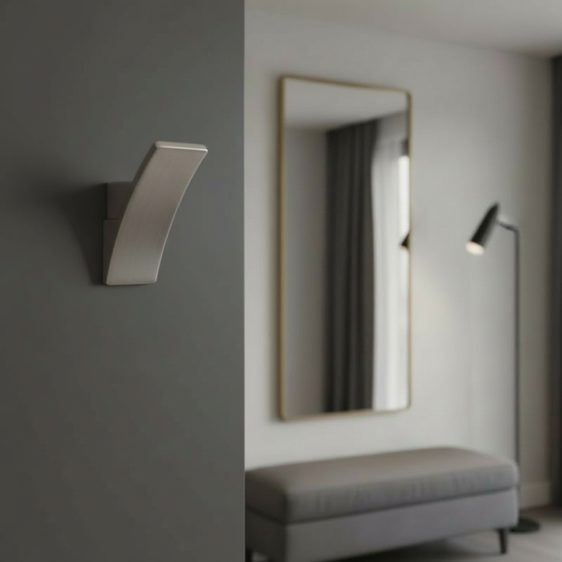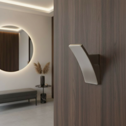 Moderní designový věšák v broušeném niklovém provedení, který svými čistými liniemi zapadne do moderních i minimalistických interiérů. Díky svému tvaru může sloužit nejen jako praktický věšák, ale také jako nábytková úchytka – knopka.