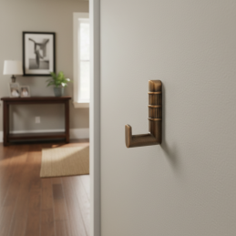 Věšák je vyroben z kvalitního kovu s broušenou mosaznou povrchovou úpravou, která působí teple a elegantně. Montáž je z přední strany na podložku, což zajišťuje pevné uchycení a jednoduchou instalaci.