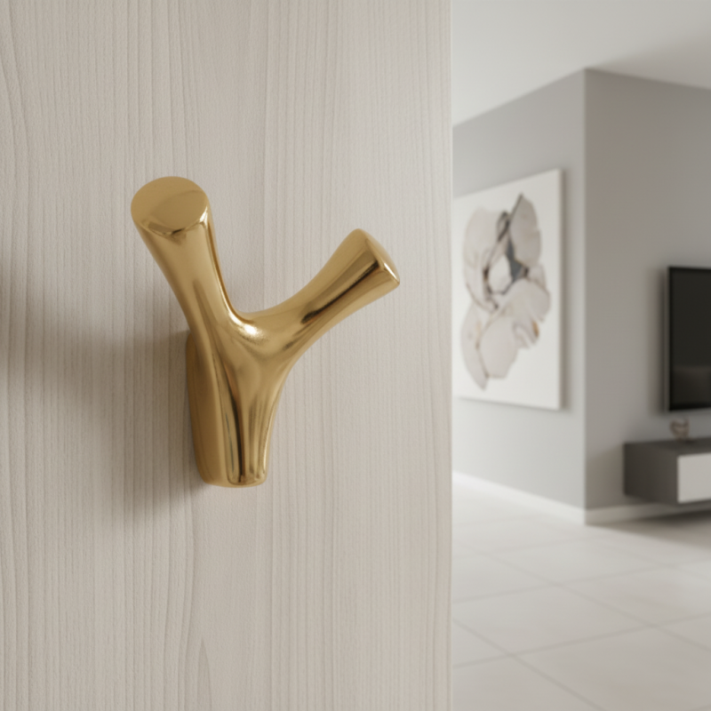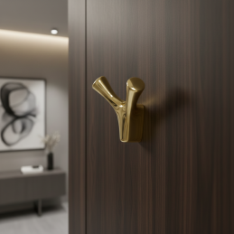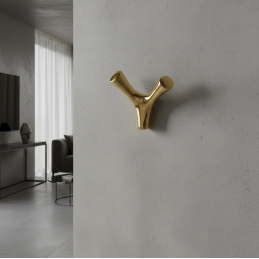 Věšák YPSILON v povrchové úpravě zlatá lesklá přináší do prostoru nádech elegance a moderního luxusu. Jeho ikonický tvar připomínající písmeno Y poskytuje pohodlné a stabilní odkládání oděvů, kabelek či doplňků. Vysoce kvalitní kovový základ pokrytý lesklou zlatou vrstvou vytváří exkluzivní vzhled, který se stává výrazným designovým prvkem interiéru.