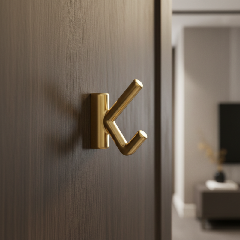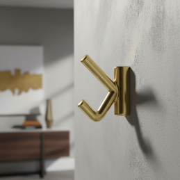Věšák je vyroben z kvalitního kovu s broušenou zlatou povrchovou úpravou, která dodává prostoru luxusní a sofistikovaný vzhled. Montáž je z přední strany na podložku, což zajišťuje pevné, stabilní a esteticky čisté uchycení.