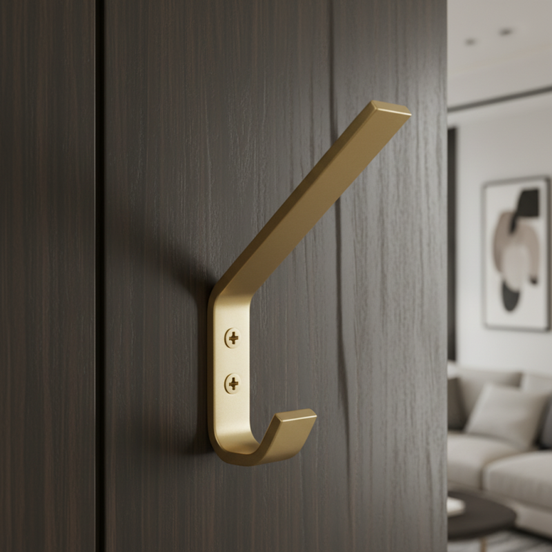 Věšák je vyroben z pevného kovu s kvalitní povrchovou úpravou, která zaručuje jeho dlouhou životnost. Montáž probíhá jednoduše zepředu pomocí šroubů, které jsou součástí balení. Dlouhé horní rameno je vhodné na bundy a kabáty, spodní háček nabízí prostor pro tašky či příslušenství.