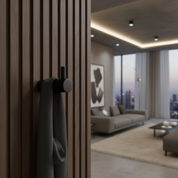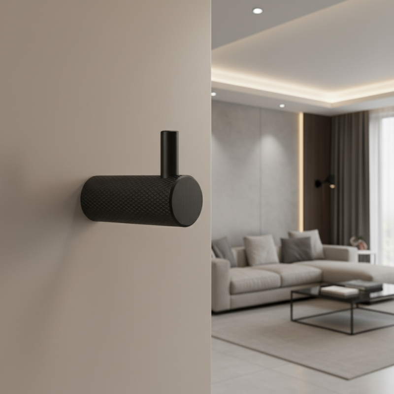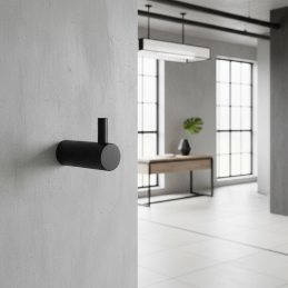 Věšák INDUST UNO ve stylové černé matné povrchové úpravě přináší čistý industriální design s výrazným rýhovaným (knurled) povrchem. Díky svému kompaktnímu tvaru a elegantní siluetě je ideální do předsíně, koupelny, kuchyně, šatníku i kanceláře.
