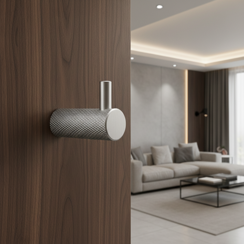 Věšák INDUST UNO v povrchové úpravě ušlechtilá ocel mat spojuje moderní industriální design s elegantním saténovým vzhledem. Válcové kovové tělo s výraznou rýhovanou (knurled) texturou dodává věšáku technický charakter a zároveň zvyšuje odolnost povrchu při každodenním používání.