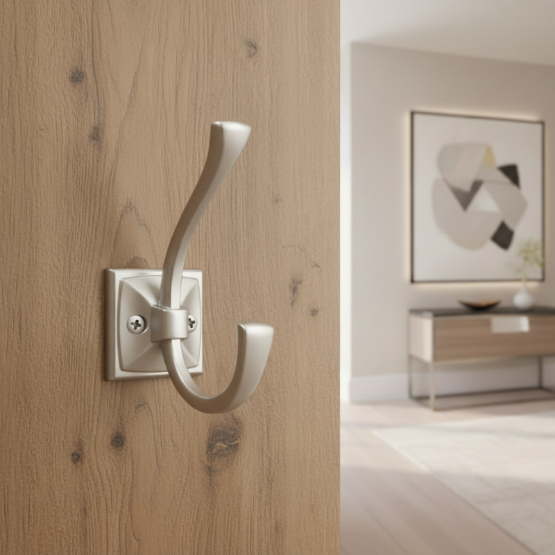 Věšák se montuje zepředu pomocí šroubů, které jsou barevně sladěné s jeho povrchem. Elegantní čtvercová podložka a tvarovaná ramena věšáku vytvářejí harmonický a vizuálně atraktivní celek.