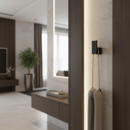 Věšák DESIGNO v černé matné barvě je ideální volbou pro zákazníky, kteří hledají čistý design, diskrétní řešení a vysokou funkčnost v moderním interiéru.