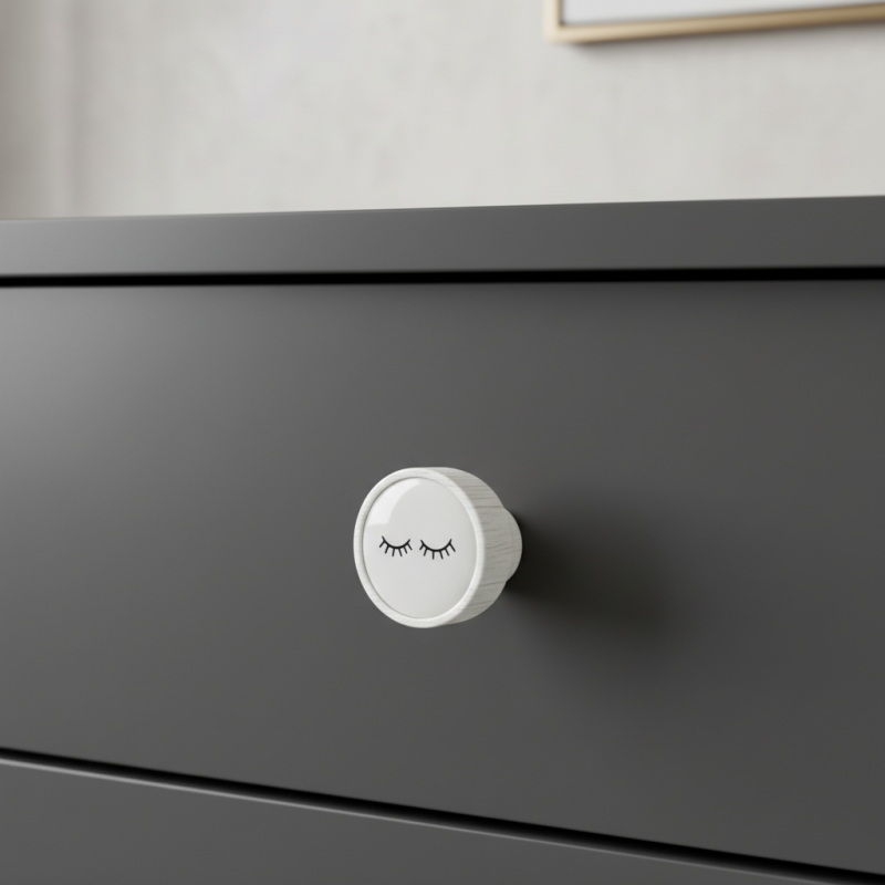 Dřevěná úchytka ARSIA v matném bílém provedení s jemným motivem zavřených očních řas je moderním a hravým doplňkem, který se perfektně hodí do dětských či dívčích pokojů. Minimalistická grafika působí něžně, čisté bílé tělo úchytky dodává nábytku elegantní vzhled a masivní bukové dřevo zajišťuje dlouhou životnost.