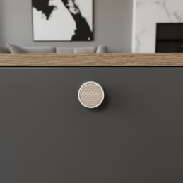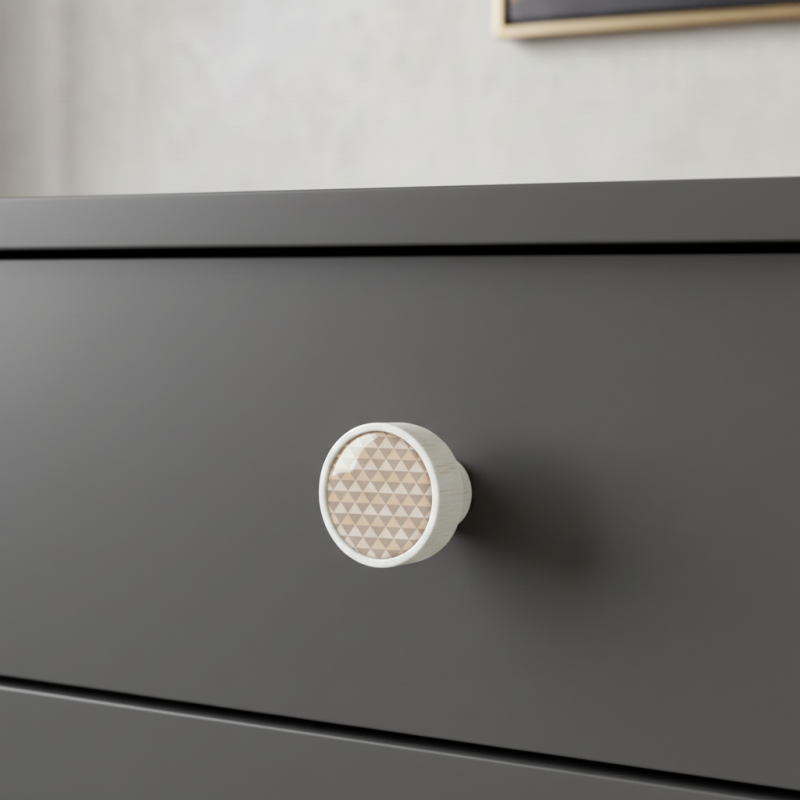 Dřevěná úchytka ARSIA v bílém provedení s jemným trojúhelníkovým vzorem je ideálním doplňkem pro moderní i skandinávský interiér. Kombinace masivního bukového dřeva, bílého laku a decentního geometrického motivu působí harmonicky, svěže a dodává nábytku nadčasový designový prvek.