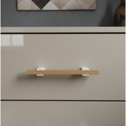 Úchytka je vyrobena celá ze dřeva, přičemž bílé konce jsou povrchově upraveny odolnou matnou barvou. Středová část je z bukového masivu s čirým lakem, který zachovává přirozenou texturu dřeva.