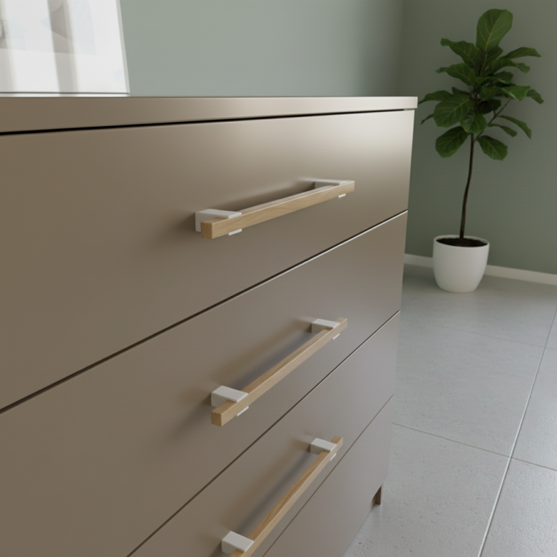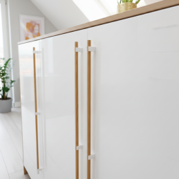 Dřevěná úchytka LEO v kombinaci přírodního bukového dřeva a bílých matných dřevěných konců působí mimořádně moderně a útulně. Díky svému minimalistickému tvaru a přírodním materiálům je ideální volbou pro skandinávský, dětský i moderní interiér.