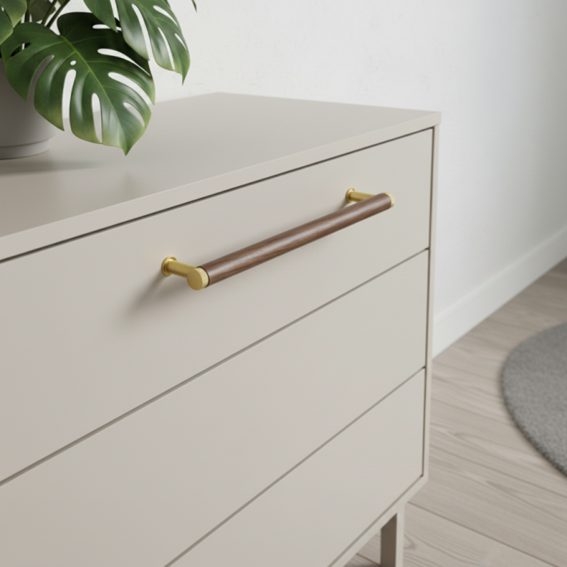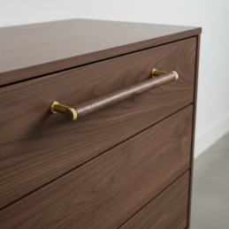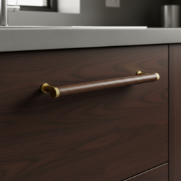 Dřevěná úchytka SOHO v kombinaci lakovaného ořechu a zlatých kovových detailů přináší do interiéru luxusní, elegantní a moderní vzhled. Masivní ořechové dřevo s výraznou kresbou dodává úchytce přirozené teplo a prémiový charakter, zatímco zlaté kovové koncovky a nožičky vytvářejí sofistikovaný kontrast, který vynikne v moderních i klasických prostorech.