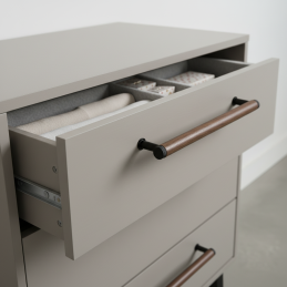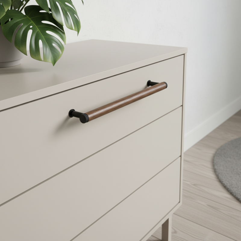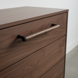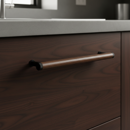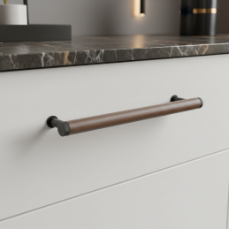 Dřevěná úchytka SOHO v kombinaci lakovaného ořechu a černých matných kovových detailů představuje moderní industriální design v té nejčistší podobě. Válcové tělo z masivního ořechového dřeva působí elegantně a luxusně, přičemž tmavé kovové koncovky a nožičky dodávají úchytce charakter a výjimečný kontrast.