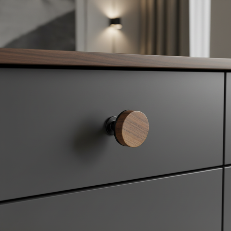 Knoflík SOHO v kombinaci lakovaného ořechového dřeva a černých matných kovových prvků nabízí moderní industriální design, který vynikne na jakémkoli nábytku. Přední část z masivního ořechu zvýrazňuje přirozenou kresbu dřeva a působí elegantně a teple, zatímco kovový podklad a nožička v černé matné dodávají úchytce dynamický kontrast.