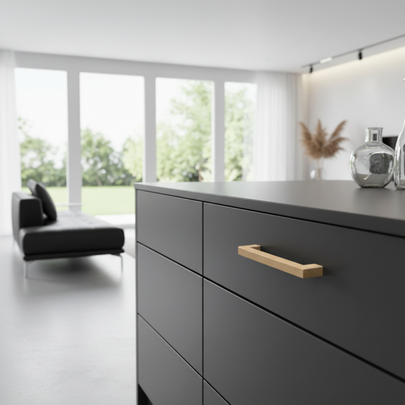 Díky jednoduchému hranovému tvaru působí úchytka moderně, čistě a snadno zapadne do skandinávského, přírodního i moderního interiéru.