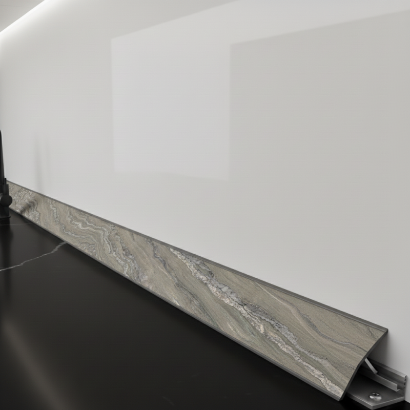 Skládá se ze dvou částí – spodní část se přišroubuje nebo přilepí na pracovní desku a horní se následně zacvakne do spodní, čímž vznikne přesné a estetické zakončení ve stejném dekoru jako pracovní deska.
