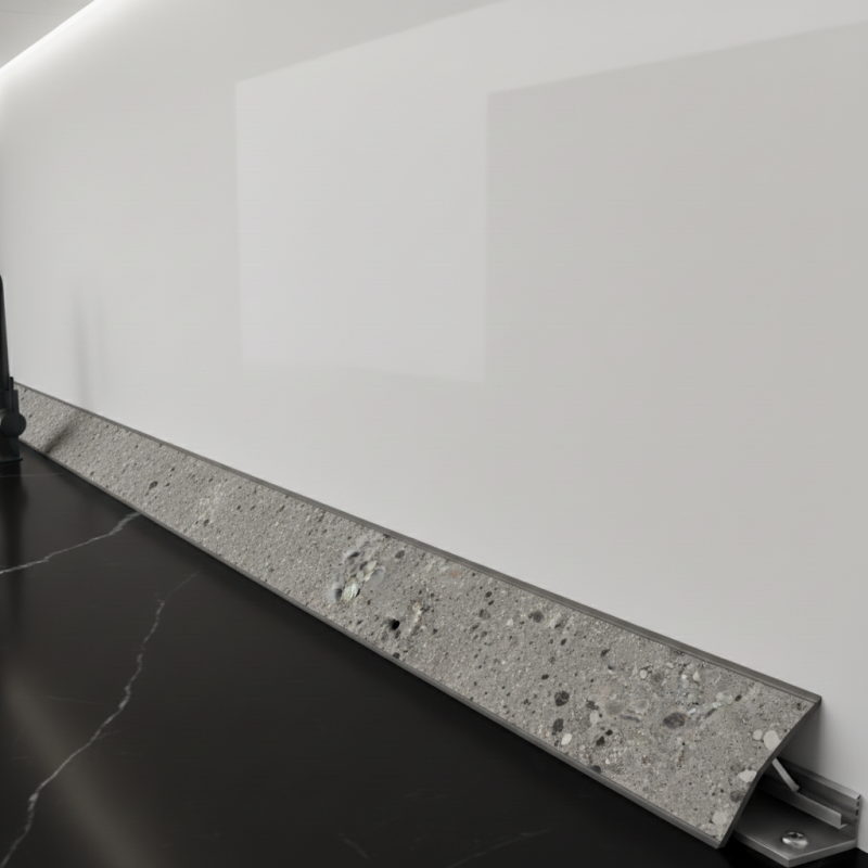 Moderní a stylová těsnicí lišta EGGER v dekoru Terrazzo Triestino šedé (F021) je určena pro elegantní a funkční zakončení pracovních desek. Spolehlivě utěsňuje spoj mezi pracovní deskou a stěnou, čímž účinně zabraňuje pronikání vody a nečistot, a zároveň přináší do interiéru trendy terrazzo efekt s kamenným vzhledem.