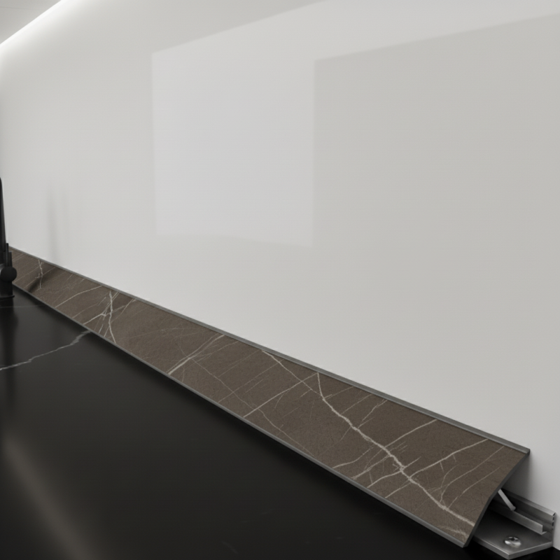Skládá se ze dvou částí – spodní část se přišroubuje nebo přilepí na pracovní desku a horní se následně zacvakne do spodní. Vzniká tak pevné, přesné a estetické zakončení ve stejném dekoru jako pracovní deska.