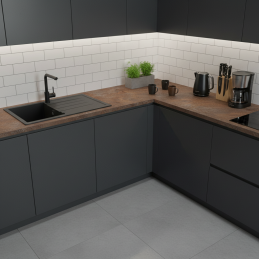 Deska je vyrobena z kvalitní dřevotřísky s laminátovým povrchem EGGER, který zajišťuje vysokou odolnost proti oděru, poškrábání, vlhkosti i teplu. Ideální pro kuchyňské linky, kancelářské prostory či moderní interiéry s industriálním charakterem.