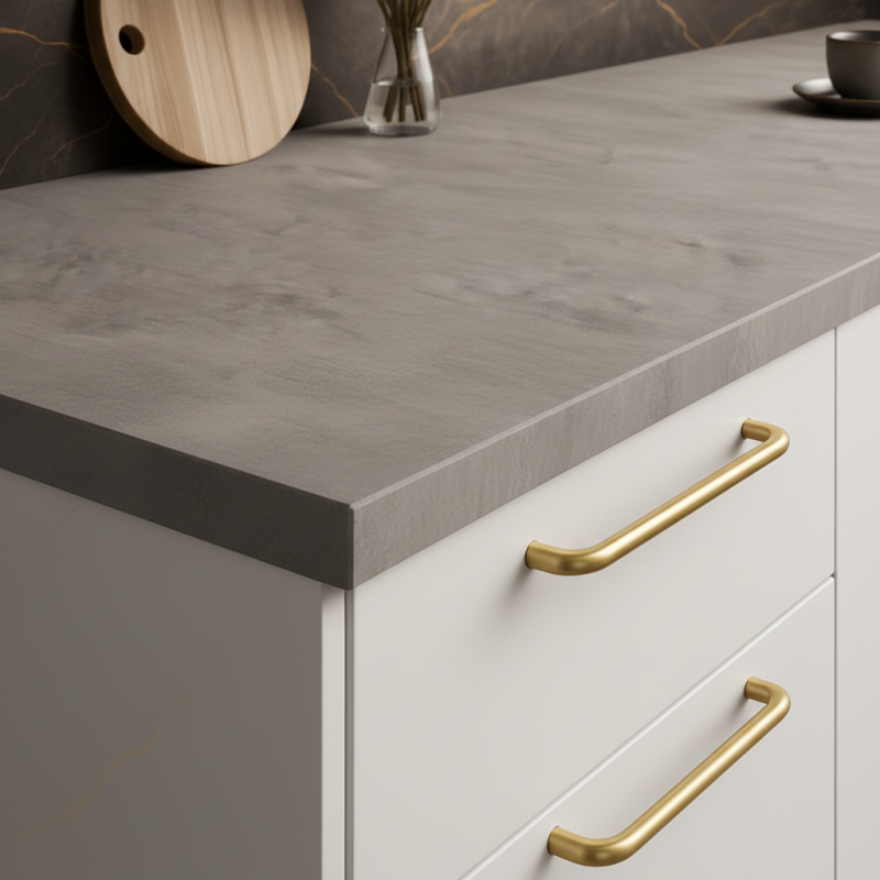 Povrchová struktura ST10 Deepskin Rough věrně imituje kovovo-betonový charakter s jemnou texturou, která je příjemná na dotek a zároveň odolná vůči poškození. Tento dekor se skvěle kombinuje s dřevodekory i jednobarevnými povrchy.