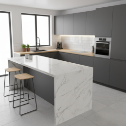 Pracovní deska EGGER Křišťálový mramor představuje dokonalé spojení elegantního mramorového vzhledu a vysoké funkčnosti.