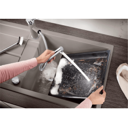 Blanco Metra XL 6 S je moderní granitový kuchyňský dřez s čistými liniemi a atraktivním designem. Vyznačuje se obzvlášť velkou vaničkou s hloubkou 190 mm, která poskytuje vysoký komfort při mytí i větších hrnců a kuchyňského nádobí. Dřez je doplněn o funkční odkládací / odkapávací plochu, díky které je práce v kuchyni ještě efektivnější.