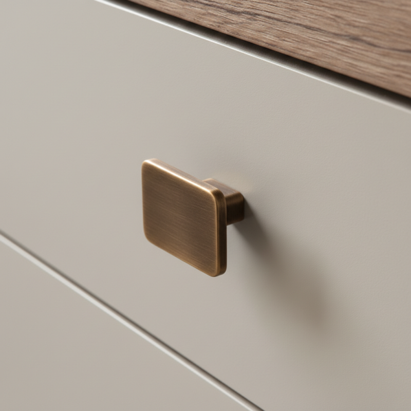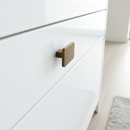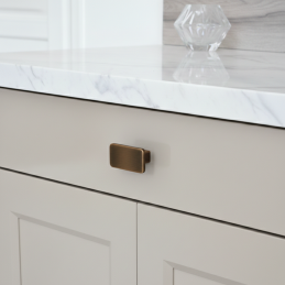 Úchytka je vyrobena z kvalitního kovu s mosaznou povrchovou úpravou, což zajišťuje pevnost, stabilitu a dlouhou životnost. Jednoduchý geometrický tvar se zaoblenými hranami nabízí pohodlný úchop a čistý design.