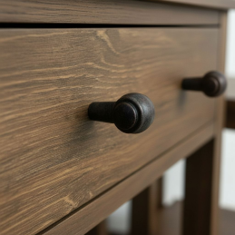 Tmavá patinovaná úprava dodává knoflíku luxusní starobylý vzhled, který zvýrazní přirozenou strukturu povrchu a dokonale doplní dřevo i kovové prvky v interiéru.