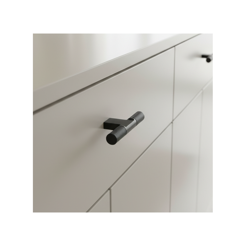 Moderní designová knopka INDUST DUO v černé matné barvě je ideálním doplňkem pro industriální i minimalistické interiéry. Charakteristický rýhovaný povrch dodává úchytce luxusní technický vzhled a zároveň zajišťuje pohodlný a jistý úchop.