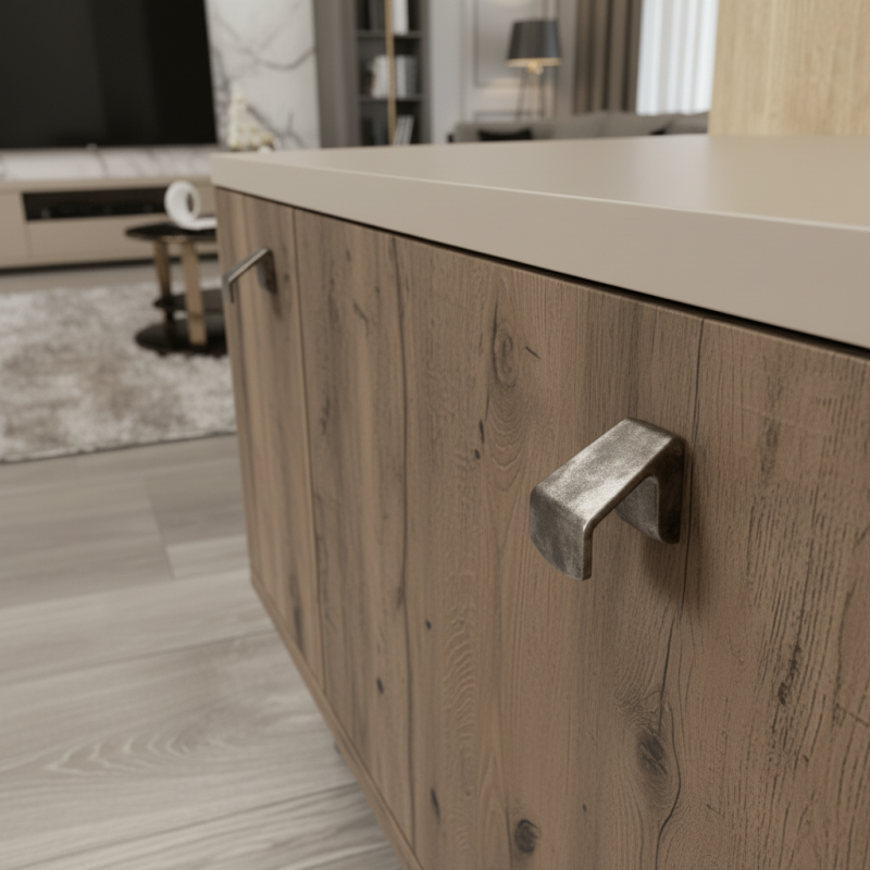 Její jemně patinovaný kovový vzhled dodává skříňkám, komodám či nočním stolkům výjimečný charakter a nadčasovou estetiku.