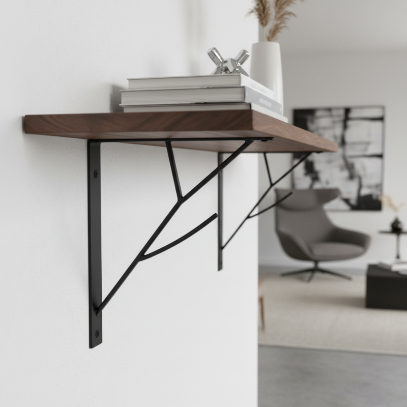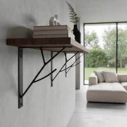 Držák FOREST v elegantní černé barvě kombinuje funkčnost s jemným dekorativním prvkem. Originálně tvarovaná výztuha připomínající větev působí esteticky a zároveň přidává konstrukci pevnost. Ideální volba pro interiéry, kde chcete spojit praktičnost a jemný designový detail.