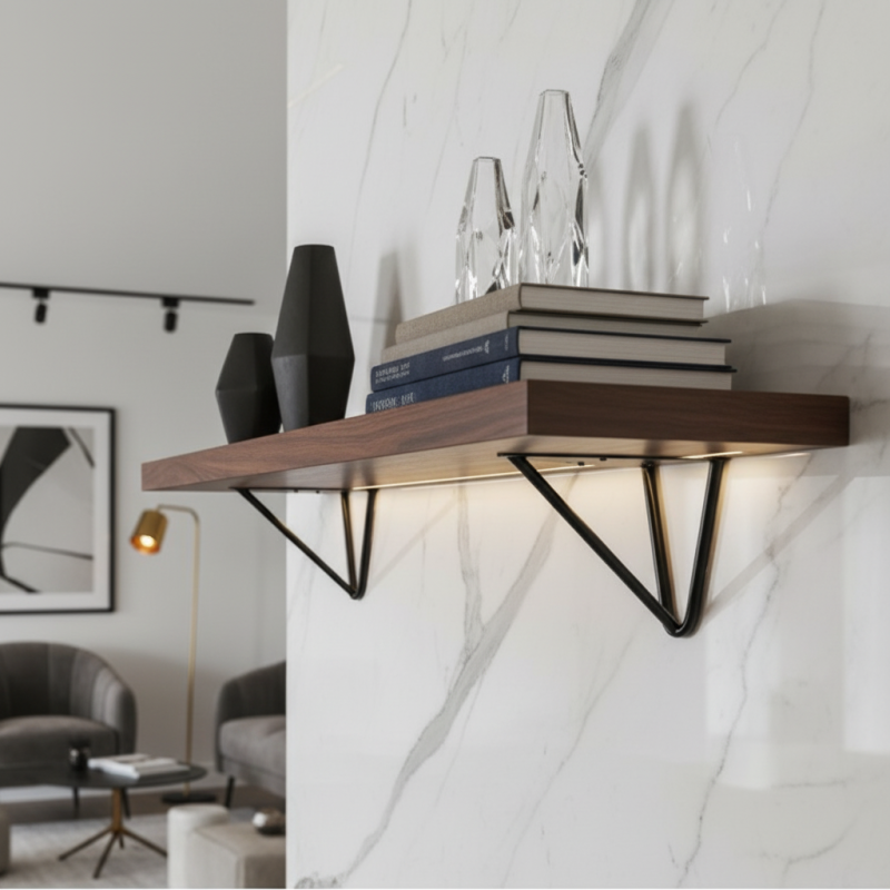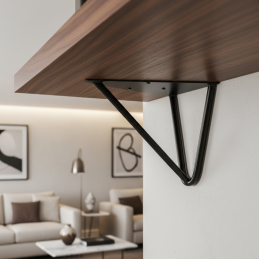 Moderní a pevný držák police v oblíbeném hairpin stylu, který spojuje minimalistický design s vysokou odolností. Díky ocelové konstrukci a promyšlené výztuze poskytuje výbornou stabilitu i při větším zatížení, a proto je vhodný do kuchyně, obýváku, pracovny či dílny.
