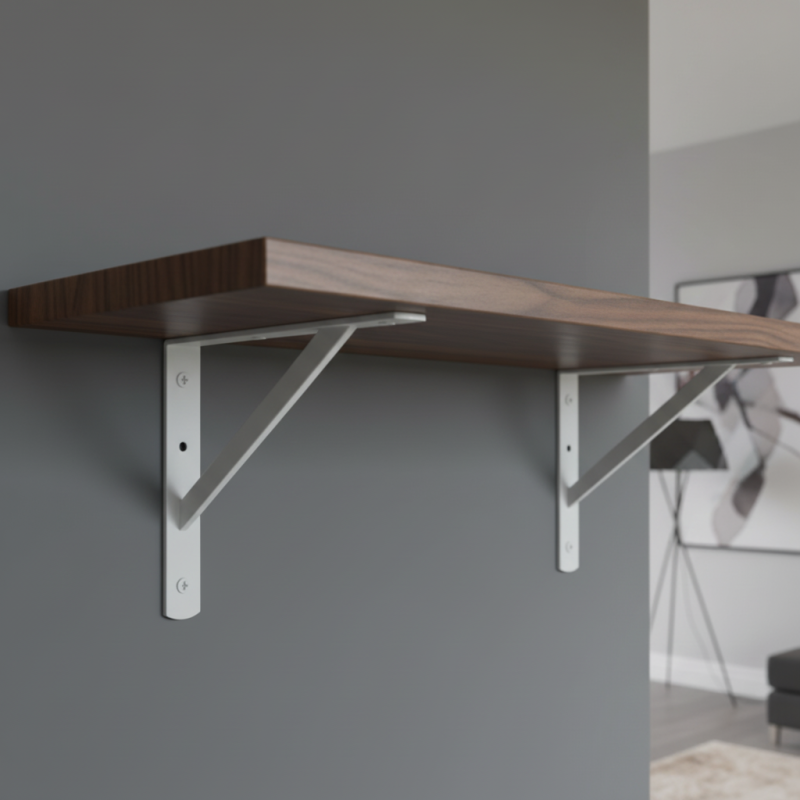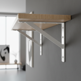 Kovový držák police v moderním industriálním designu. Určený k montáži na stěnu, vhodný pro dřevěné i laminované police. Robustní konstrukce se šikmou výztuhou zajišťuje vysokou pevnost a stabilitu.