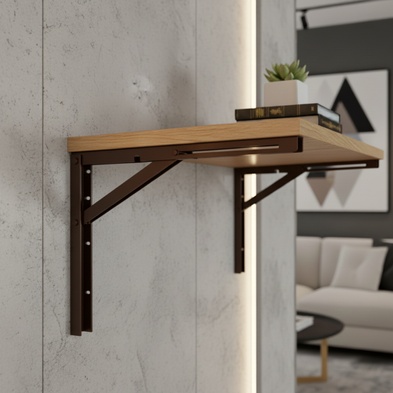 Univerzální sklápěcí konzola ideální pro police, skládací stolky, pracovní desky či barové pulty. Robustní ocelová konstrukce v elegantní tmavě hnědé barvě zajišťuje vysokou pevnost, dlouhou životnost a atraktivní vzhled, který se hodí do moderních i tradičních interiérů.