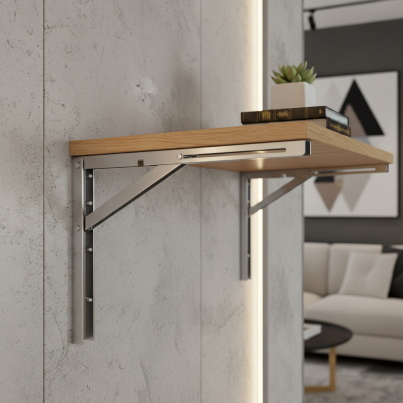 Pevná a praktická sklopná konzola vhodná pro police, skládací stolky, pracovní desky či barové pulty. Díky pozinkovanému povrchu nabízí konzola zvýšenou odolnost proti korozi, což ji činí vhodnou nejen do interiéru, ale i do méně chráněných prostor — garáže, sklepy či dílny.