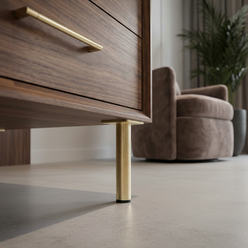 Moderní nábytková nožička LEONOR v elegantním provedení zlatá broušená je stylovým doplňkem pro různé typy nábytku. Díky čistému válcovému tvaru a jemnému broušenému povrchu dodává nábytku luxusní a moderní vzhled.