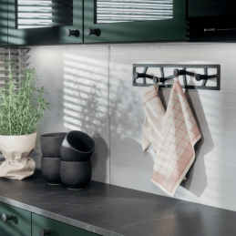 Praktickou výhodou je montáž z přední strany, která zajišťuje snadnou instalaci a čistý vzhled bez viditelných upevňovacích prvků ze stran. Věšák je možné kombinovat i s menší variantou ze stejné série, která může sloužit i jako nábytková úchytka, čímž vytvoříte jednotný design v interiéru.