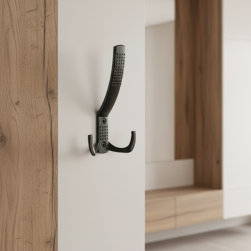 Robustní a elegantní nábytkový věšák se dvěma háčky, navržený pro pohodlné odkládání i těžších oděvů. Díky moderní matné černé povrchové úpravě působí stylově a jednoduše se kombinuje s různým nábytkem a kováním. Ideální do předsíní, šaten a komerčních prostor.