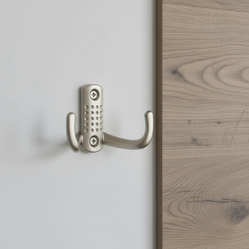 Moderní nábytkový věšák se dvěma praktickými háčky, ideální pro každodenní odkládání oblečení či doplňků. Saténový niklový povrch dodává jemný, elegantní vzhled a skvěle ladí s moderním i klasickým nábytkem.